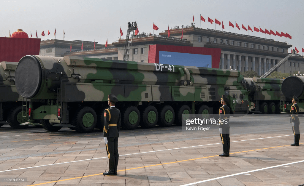 [On parade, the Chinese Dong Feng (East Wind)-41 ICBM, with 8-10 MIRVed thermonuclear warheads]