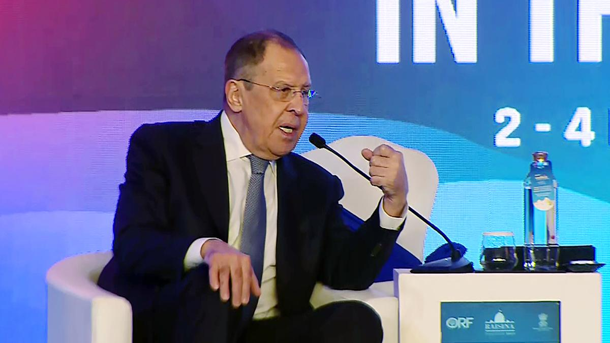 [Russia foreign minister Sergey Lavrov making a point at the Raisina Dialogue]