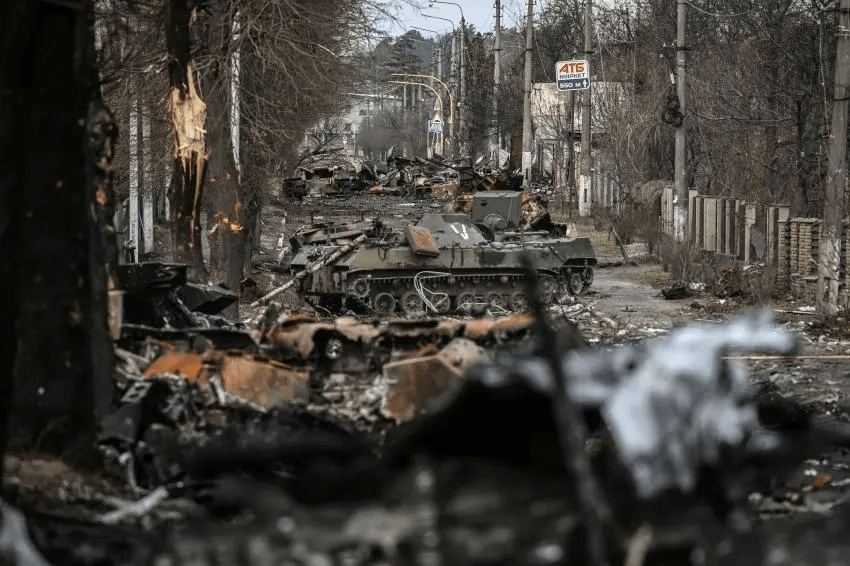 [Destroyed Russian tanks and armoured combat vehicles in the town of Bucha, Ulraine]