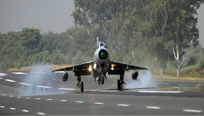 [A PAF (ex-Chinese) F-7P taking off from possibly the Lahore-Islamabad motorway]